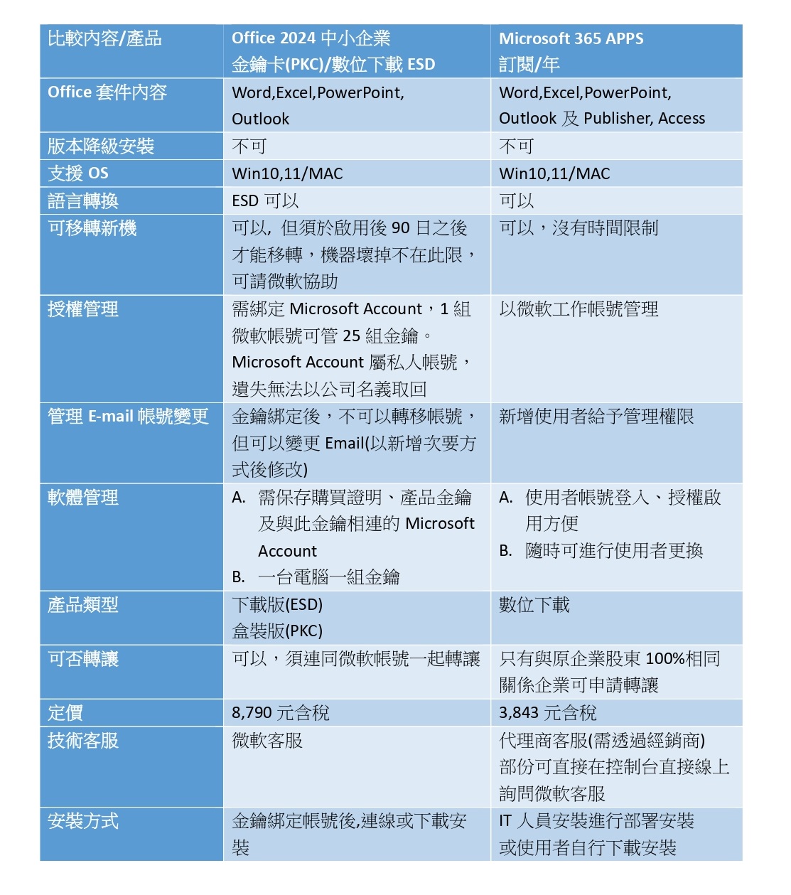 Office 2024 中小企業版(買斷型) 與 Microsoft 365 Apps (訂閱型) 的OFFICE 有什麼不同?