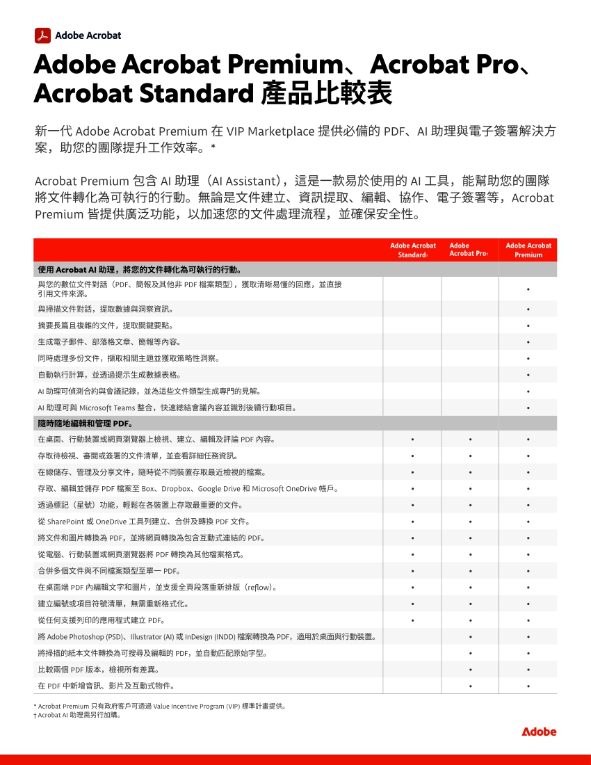 提供Acrobat 進階、Acrobat專業、Acrobat 標準 產品比較表 之功能比較 (2025/9更新)