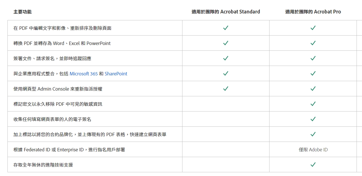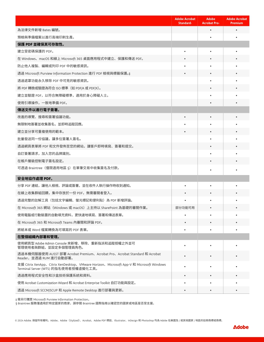 Acrobat 進階、Acrobat專業、Acrobat 標準 功能比較表
