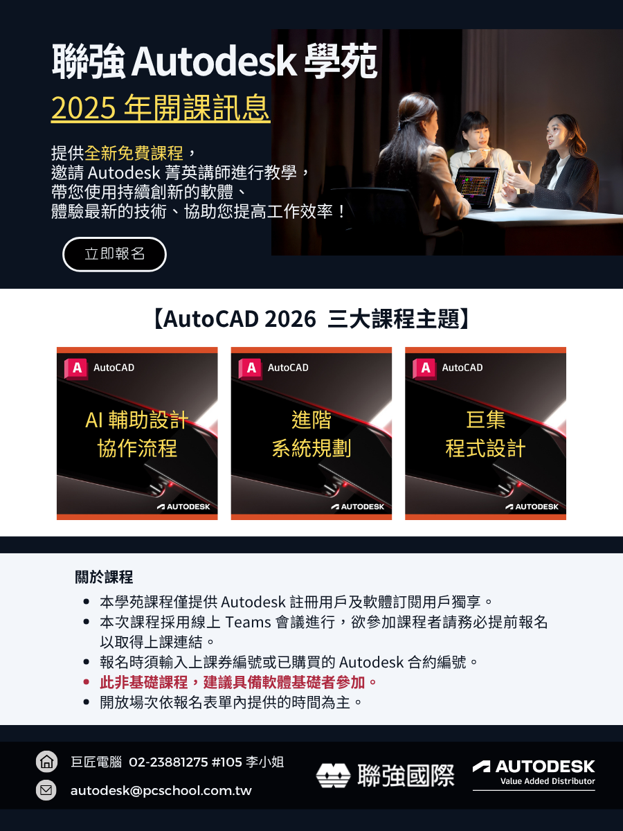 | 2025/07/22(二) | 11:00-12:00 | 【建築業】Autodesk工程建設軟體集: 驚艷新功能盤點 | 列舉Autodesk工程建設軟體集裡眾多軟體的功能更新!著重包含Navisworks、ReCap Pro與Infraworks等的重大進展,展示如何用這些新工具讓你的工程設計和建模更高效、更精準,節省更多時間與成本。 | 張淳茜 | 聯強產品技術專案副理 | 線上 報名 |