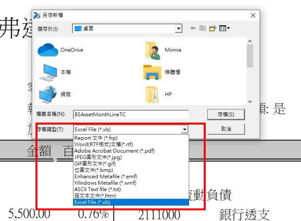 按下後, 出現『另存新檔』後, 再按下方選單, 選擇pdf 或excel 等檔案格式。