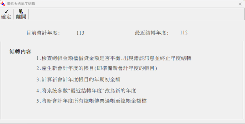 2.會檢查總帳的借、貸是否平衡,如果不平衡的話系統會顯示錯誤訊息,並結束年度結轉的動作。