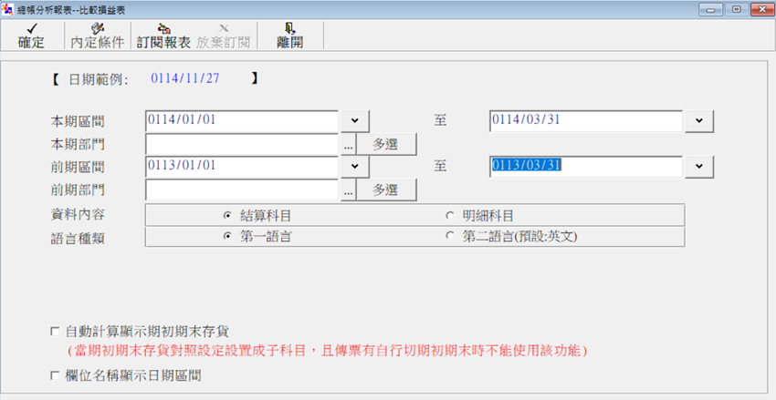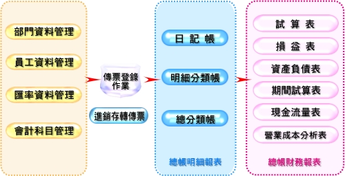 1.比較損益表 2.比較資產負債表 3.月份別科目彙總表 4.科目幣別彙總表 5.科目別彙總表 6.部門別損益明細表 7.部門別損益彙總表 8.部門別資產負債表 |