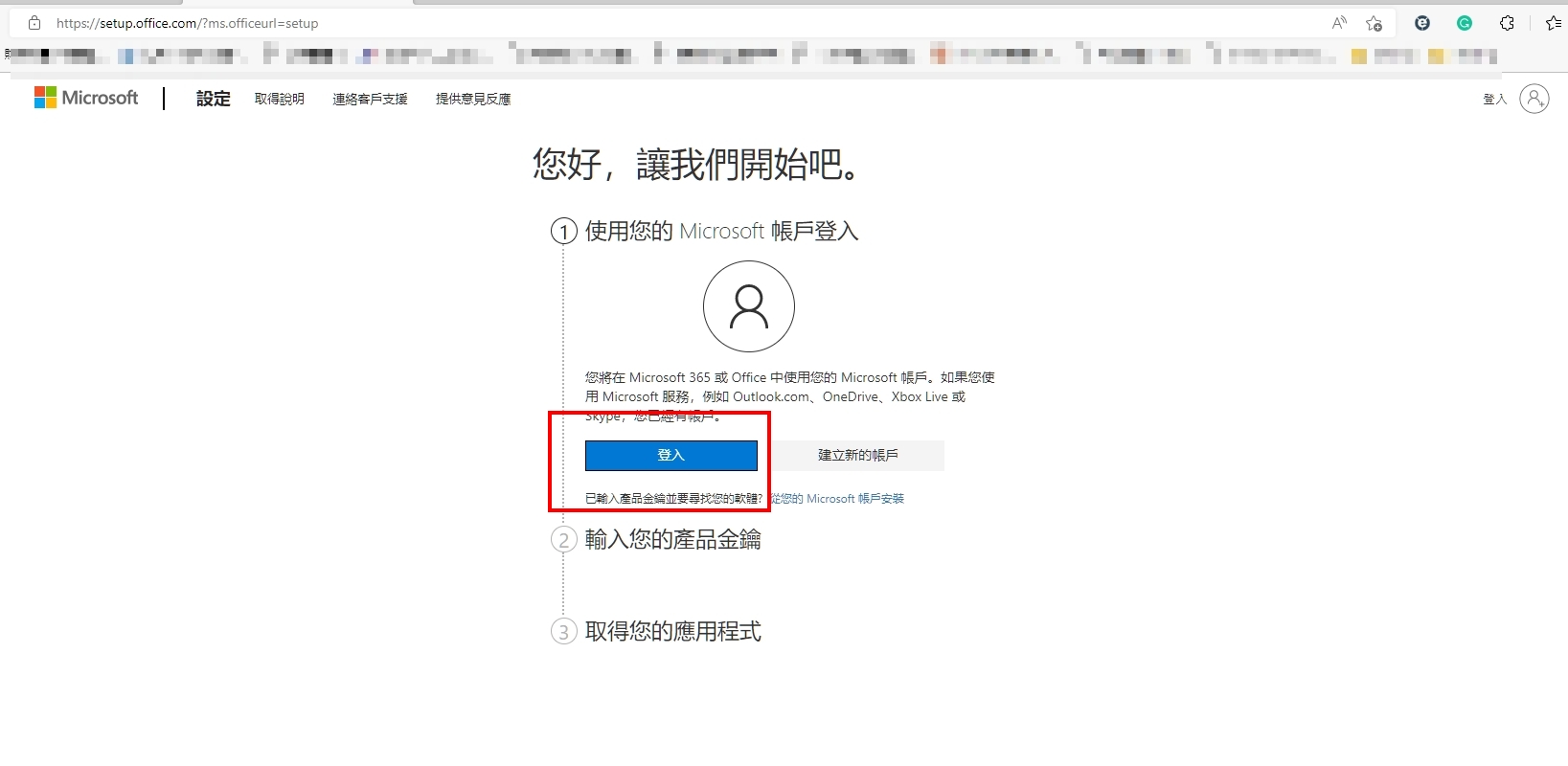 至 Office.com/setup ,如果出現提示,按『登入』後請使用原來Microsoft 365 訂閱的 Microsoft 帳戶登入(原來輸入金鑰的帳號),不可使用受邀的使用者帳號。