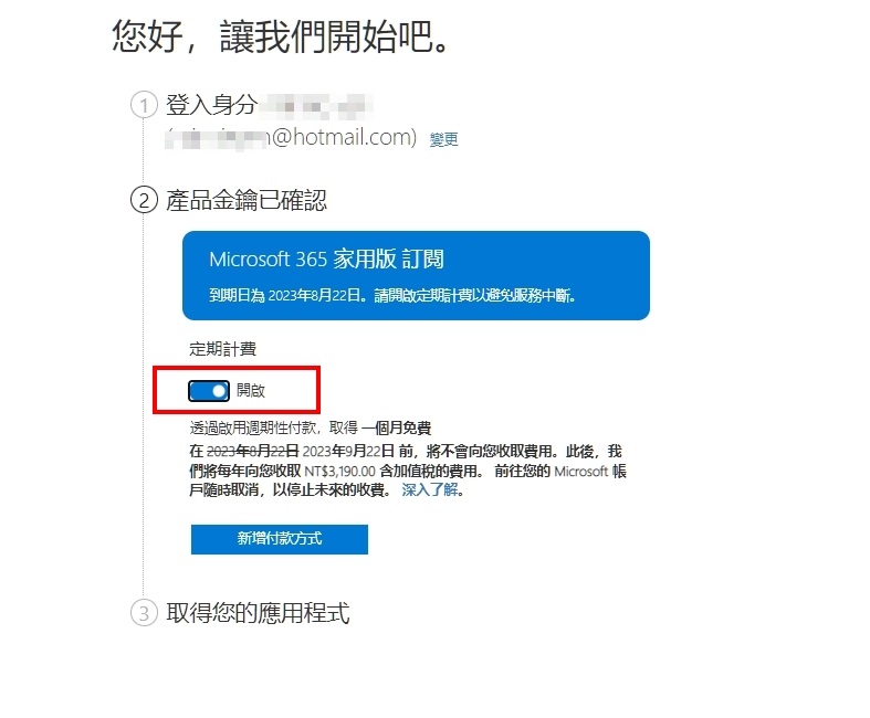 3. 依照步驟完成續約。若不想要改為信用卡自動扣款,請將『定期計費』的功能關閉,不然會進入輸入信用卡畫面