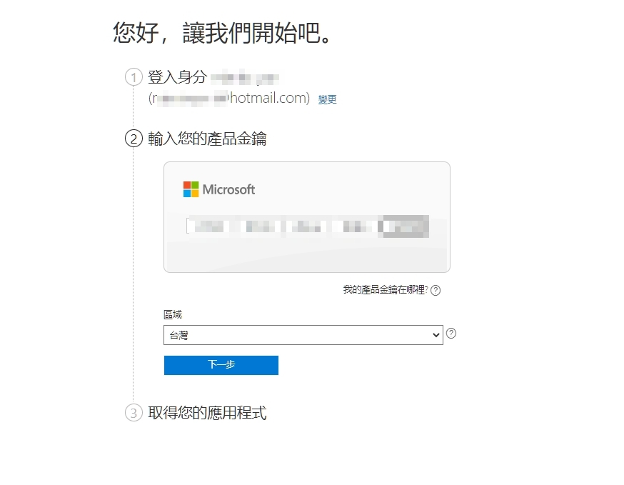 2. 輸入 25 個字元的產品金鑰後。通常會自動出現你購買金鑰的地區『台灣』。