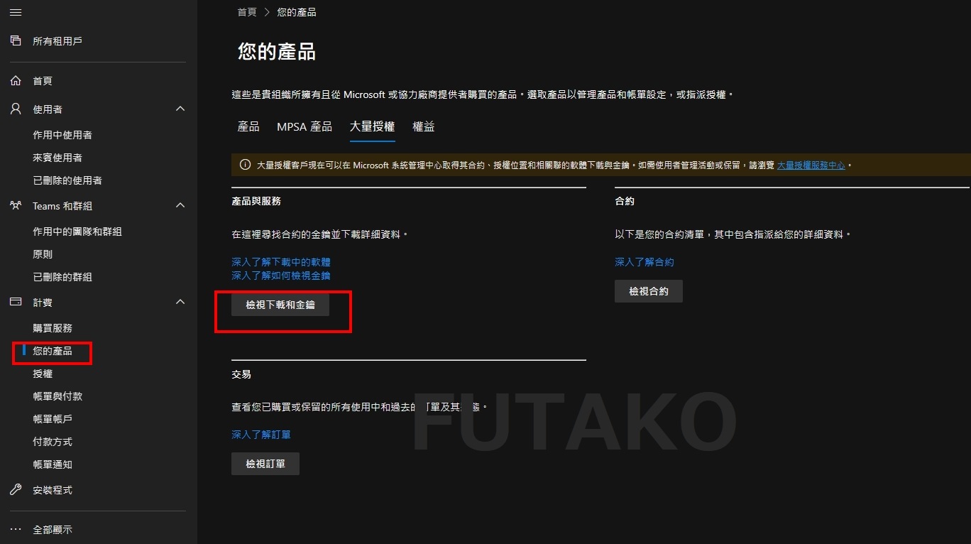 1. 請登入admin.microsoft.com 在 Microsoft 365 系統管理中心中,移至 [計費 ] > [您的產品] > [大量授權]頁面。