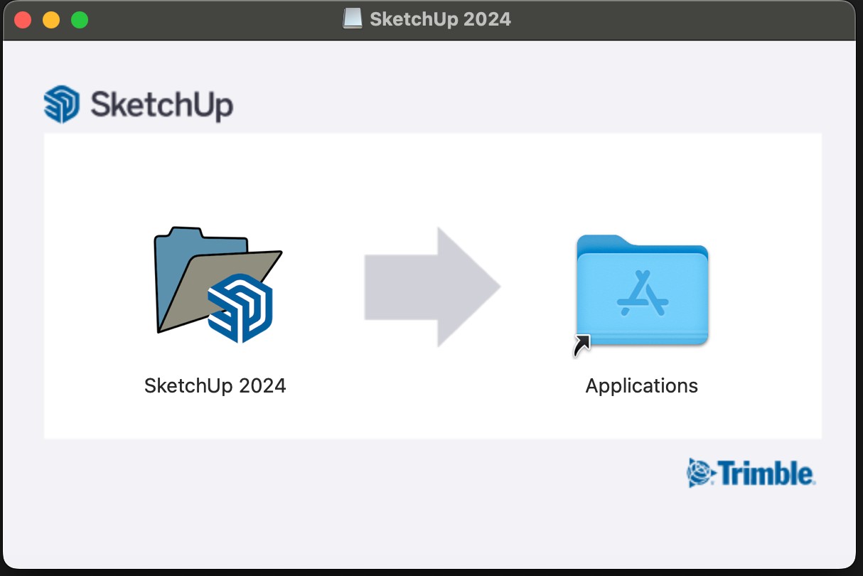 點擊並開始執行SketchUp的安裝檔案,將左側的SketchUp圖示向右拖曳至Applications的圖示即可以完成安裝