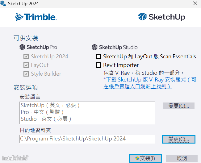 另Sketchup Studio的語系,因為包含了Revit Importer、Scan Essentials僅支援英文語系,所以預設維持英文語系安裝即可以。