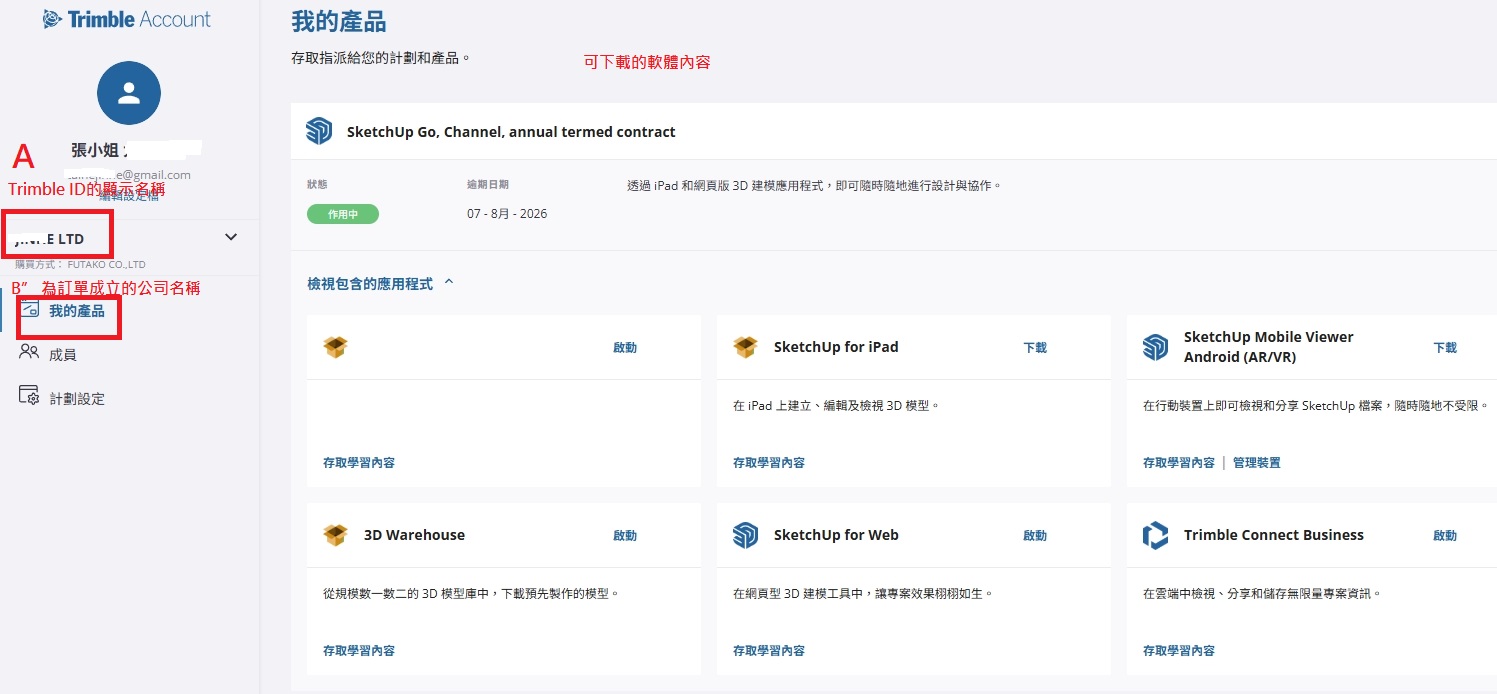 - “標記A” 為Trimble ID的顯示名稱,並非SketchUp授權的有效對象。