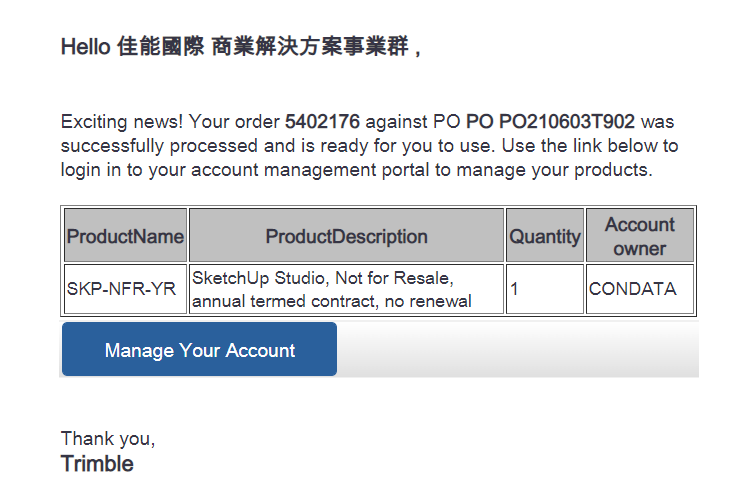 請移至您在訂閱SketchUp的留存信箱,查收來自Trimble的確認訂閱系統信。
