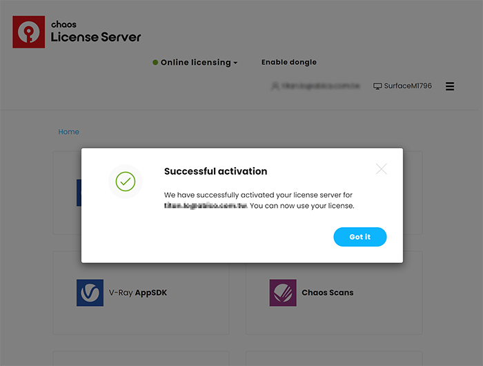 至此,您已經完成了 V-Ray 產品的授權啟用了