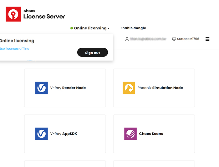【注意事項】如果要取消本機的授權,僅需要在同樣的位置:ONLINE LICENSING按下SIGN OUT,登出您的Chaos ID即可以。