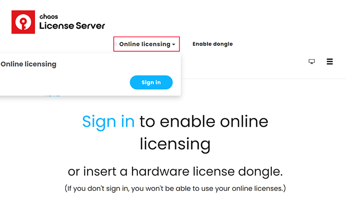 【步驟二】您可以在 【ONLINE LICENSING】點擊一下,按下【SIGN IN】以登入您的V-Ray帳號。